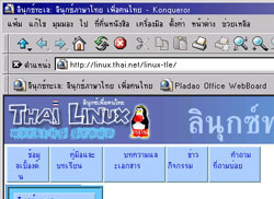 ลองไปเยี่ยมเว็บไซต์ของ Linux TLE 4.1 กันหน่อยดีไหม ภาพที่ได้ก็แจ๋วครับ เมนูตัวอักษรภาษาไทยอ่านได้สบายตา ความจริงผมลองเข้าไปดูหลายเว็บไซต์ครับ ตัวบราวเซอร์ที่ให้มานี่ยังไม่มีปลั๊กอินของพวก Macromedia Flash, Shockwave นะครับถ้าไปเจอไซต์แบบนั้นจะมีการดาวน์โหลดปลั๊กอินเพื่อมาติดตั้งกันทันที (ผมยังไม่ได้ลองติดตั้งครับ)