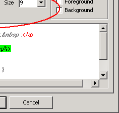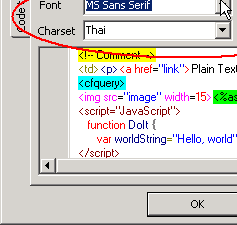 - การตั้งค่าเกี่ยวกับภาษาไทยให้โปรแกรมรับรู้ด้วยการเลือกที่เมนู Option > Editing Preferences... แก้ไขเพียงสองที่ก็ใช้ภาษาไทยได้เลยครับในวงกลมนั่นแหละ แก้ฟอนต์ให้เป็น MS Sans Serif กำหนด Charset เป็น Thai หัวข้ออื่นๆ จะเปลี่ยนตาม Default Text ส่วนช่อง Size เป็นการกำหนดขนาดตัวอักษรแสดงบนจอเท่านั้นนะครับคนตาดีก็ขนาด 9-10 สายตาวัยสะรุ่นตอนปลายอาจเป็น 11-12 ตามใจก็แล้วกัน บางคนอาจจะบอกว่าตัวอักษรสีดำบนพื้นขาวไม่ชอบใจอยากเปลี่ยนก็เชิญตามสะดวก (เปลี่ยนเฉพาะการแสดงบนจอระหว่างทำงานนะครับ ไม่เกี่ยวกับสีสันบนเว็บเพจ) สังเกตง่ายๆ ว่าผลจะเป็นอย่างไรตามกรอบตัวอย่างด้านล่างนั่นเอง