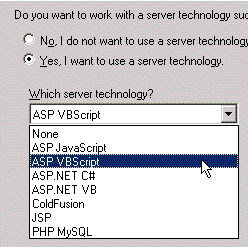 ซึ่งคุณสามารถจะกำหนดได้ว่า ให้สนับสนุนการสร้างเว็บเพจแบบไดนามิก โดยใช้เทคโนโลยีใดก็ได้ดังภาพ ในขั้นตอนการกำหนด Define Site ท่านใดที่สนใจอยากได้มาทดลองใช้งาน ก็ไปหาดาวน์โหลดมาใช้กันได้นะครับ ตัวจริงออกมาให้ใช้กันแล้ว