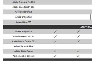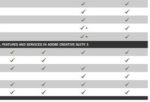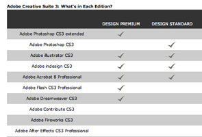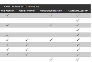 Adobe แยกผลิตภัณฑ์ออกมาเป็น 4 กลุ่มคือ 1) Adobe Creative Suite Design Standard and Premium 2) Adobe Creative Suite Web Standard and Premium 3) Adobe Creative Suite Production Premium และ 4) Adobe Creative Suite Master Suite แต่ละชุดมีอะไรบ้างลองดูในตาราง