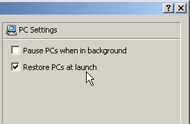 - หน้าต่างแสดงการตั้งค่าจะปรากฏขึ้น ที่หัวข้อแรกเป็นการกำหนดว่าจะให้เครื่องจำลองหยุดชั่วคราวหรือไม่เมื่อทำงานอยู่เบื้องหลัง (ค่าปกติจะไม่หยุด) และอีกช่องหนึ่งจะกำหนดให้เครื่องจำลองทำงานในตำแหน่งสุดท้ายก่อนการปิดครั้งก่อน