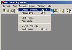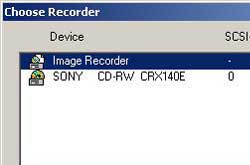 - เริ่มกันที่ตัวโปรแกรมก่อนครับ ปกติโปรแกรมจะตั้งค่าให้เราเขียนไฟล์ลงบนซีดีผ่านเครื่องเขียนซีดี ถ้าจะทำอิมเมจไฟล์เราต้องเปลี่ยนค่ากำหนดของโปรแกรมก่อนให้เขียนไฟล์ลงบนฮาร์ดดิสก์แทน ด้วยการคลิกที่เมนู Recorder เลือก Choose Recorder...