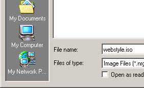 - จะมีหน้าต่างให้เราเลือกไฟล์อิมเมจจากไดรว์ที่เราเก็บไฟล์ไว้ (ตัวอย่างนี้คือไฟล์ชื่อ webstyle.iso) คลิกเลือกไฟล์ที่ต้องการแล้วคลิกที่ปุ่ม Open