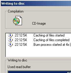 - กระบวนการเขียนก็จะเริ่มขึ้นโดยการคลายไฟล์อิมเมจเข้าสู่ระบบแคชของโปรแกรม แล้วเริ่มการเขียนด้วยความเร็วที่เลือกไว้ นั่งรอซิครับจนกว่าจะเสร็จสิ้น ถ้าไดรว์ซีดีรุ่นใหม่ๆ ความเร็วสูงก็รอไม่นาน