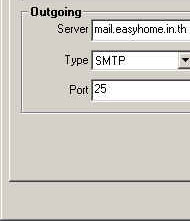 - ต่อไปก็จัดการกรอกรายละเอียดเกี่ยวกับ Server Mail ที่คุณใช้บริการอยู่ สำหรับช่อง Outgoing ถ้าอยากให้เร็วก็ใส่ SMTP ของ ISP ที่คุณต่อเชื่อมอินเทอร์เน็ตอยู่นะครับจะดีที่สุด ถ้าไม่รู้หรือไม่มีก็ใส่ตามที่ผู้ให้บริการอีเมล์ของคุณกำหนด