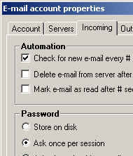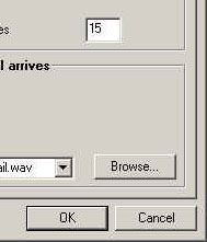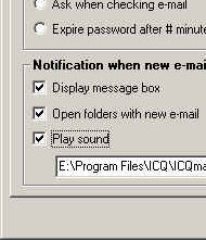 - ต่อไปจะเป็นการกำหนดเกี่ยวกับการรับจดหมาย เช่น จะให้ตรวจสอบจดหมายใหม่ทุกๆ กี่นาที จะให้ถามพาสเวิร์ดทุกครั้งไหม หรือจะให้พาสเวิร์ดนั้นหมดไปในกี่นาที (กรณีที่ใช้เครื่องร่วมกับคนอื่น) จะให้แสดงกรอบเตือนหรือใช้เสียงเตือนเมื่อมีจดหมายใหม่เข้ามา จากตัวอย่างผมใช้เสียงจากโปรแกรม ICQ คอยเตือนครับ