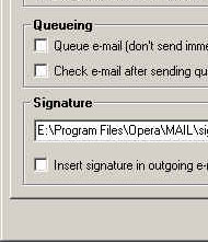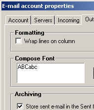 - ในหัวข้อ Outgoing จะเป็นการกำหนดรูปแบบจดหมายที่เราจะส่งไป เช่น การตัดคำขึ้นบรรทัดใหม่เมื่อข้อความยาวเกินกว่ากี่ตัวอักษร การเซ็ทฟอนต์ภาษาไทยปกติก็ใช้ฟอนต์ MS Sans Serif ครับ การเก็บไฟล์จดหมาย การส่งไฟล์เลยทันที และรายละเอียดที่เกี่ยวกับตัวคุณที่เรียกกันว่า ลายเซ็นอิเล็กทรอนิกส์