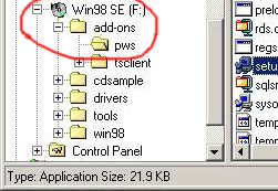 - จากแผ่นโปรแกรม Windows 98 Full ให้คลิกเข้าไปที่โฟลเดอร์ Add-ons > PWS ดับเบิ้ลคลิกที่ไฟล์ Setup.exe ดังภาพ