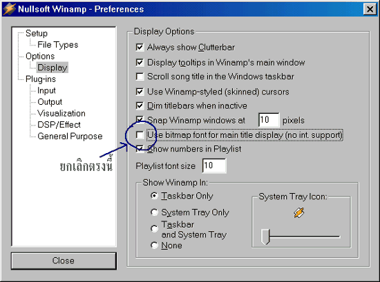 - สำหรับท่านที่ใช้ WinAmp 2.10 ต้องการแสดงชื่อเพลงภาษาไทย โดยไม่ต้องใช้ plug-in ให้ กด Ctrl+P เพื่อเข้าไปที่ Preferences