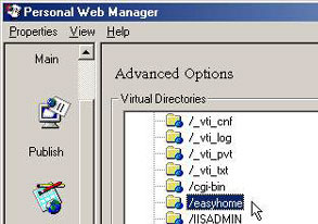 - จากตัวอย่างจะเห็นว่ามีไดเร็กทอรีชื่อ easyhome เพิ่มเข้าไปใน C:\Inetpub\wwwroot ทำให้สะดวกไม่ต้องก็อบปี้ไฟล์มาไว้ด้วยกันจริงๆ (สามารถอ้างไปยังเครื่องคอมพิวเตอร์เครื่องอื่นได้ด้วย ถ้ามีการแชร์โฟลเดอร์นั้นไว้)