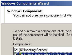 - ใน Windows Component Wizard คลิกเลือกที่ Internet Information Services (IIS) อาจคลิกดูที่ Details เลือก Component ที่ต้องการ (แนะนำให้เลือกทั้งหมด)